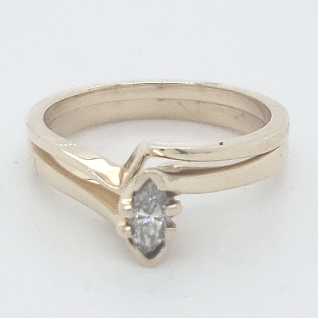 14KY diamond engagement ring and wedding band. 0.21 ct. marquise diamond. 6 prong head (2 V tips). VS G. 1 piece cast ring has a twist looking head and bypass style shanks, shadow wedding band curved to fit engagement ring.