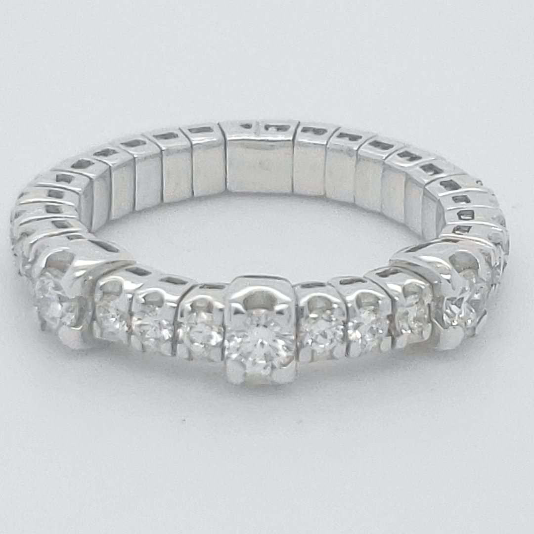 18KW ladies expandable ring with 19 diamonds=0.67 ct. TW, the 3 larger diamonds=0.27 ct. TW and the 16 smaller diamonds=0.40 ct. TW, all of the diamonds are set with 4 prongs each and are set in individual sections that are flexible, all bright, finger size 6 closed.